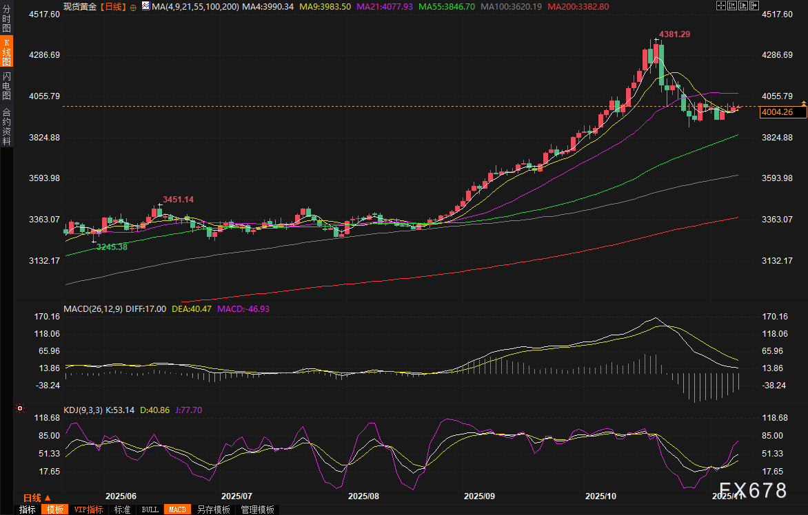 汇通财经APP讯——周一(11月10日)亚市早盘,现货黄金守住上周五涨势,一度涨至4010美元/盎司上方,较上周五收盘价4001.27美元/盎司上涨约0.2%。上周五金价上涨0.6%,成功收复4000整数关口。市场人士指出,美元指数的意外走软成为首要推手,上周五美元下跌0.15%至近一周低位,这使得以美元计价的黄金对持有其他货币的投资者而言变得更加便宜,吸引了大量海外买盘涌入。同时,美国政府关门的不确定性如阴霾般笼罩市场,显著提升了黄金的避险属性,而华尔街股指即将录得大幅周度跌幅,进一步放大了这一效应。科技股为主的纳斯达克指数上周五录得七个月来最大单周跌幅,投资者对人工智能股票涨势可持续性的担忧情绪升温,推动资金从风险资产重新转向黄金这一传统避险天堂。