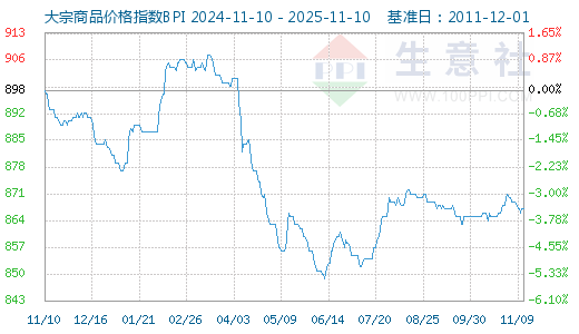 11月9日大宗商品价格指数BPI为867点,与昨日持平,较周期内最高点1343点(2021-10-19)下降了35.44%31.36%
