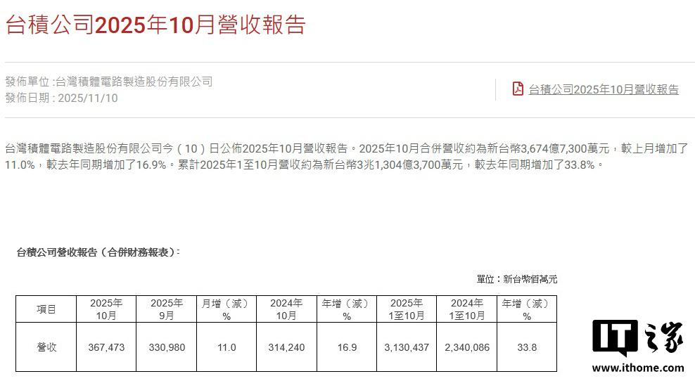 IT之家 11 月 10 日消息,今日台积电公布 2025 年 10 月营收报告,公司 10 月合并营收约为 3674.73 亿新台币(IT之家注:现汇率约合 844.45 亿元人民币),较上月增加了 11%,较去年同期增加了 16.9%。