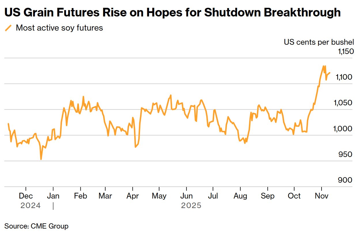 当日,1月交割的大豆期货表现尤为突出,盘中一度上涨0.7%;小麦和玉米期货亦随势上扬。受美国政府停摆40天后可能重启的积极信号影响,美国股指期货同步走高,进一步强化了市场乐观情绪。