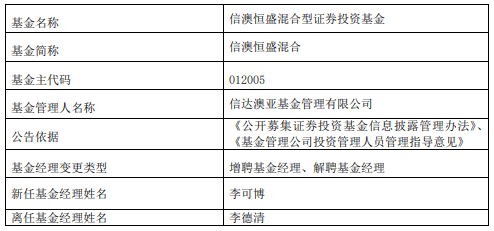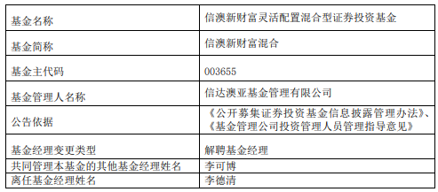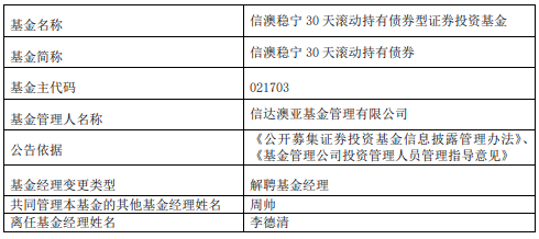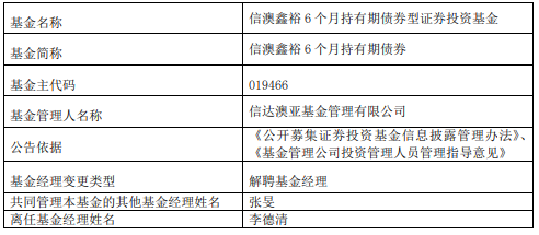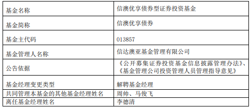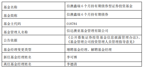 中国经济网北京11月10日讯近日,信达澳亚基金公告,李德清离任信澳优享债券、信澳新财富混合、信澳恒盛混合、信澳鑫裕6个月持有期债券、信澳稳宁30天滚动持有债券、信澳鑫瑞6个月持有期债券。