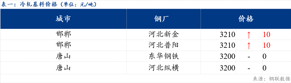今日北方市场冷轧基料3.0*1010*CSPHC河北普阳价格为3210元/吨,较上一期价格上涨10元/吨,河北纵横价格为3200元/吨,较上一期价格持稳。镀锌方面,今日北方市场价格稳中下行;轧硬方面,当前主流报价3380-3440元/吨。市场方面,热卷期货盘面先跌后涨,现货市场商家报价多跟跌出货为主,但实际成交表现一般。