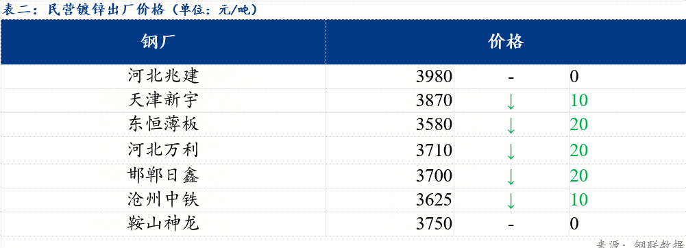 今日北方民营钢厂镀锌出厂指导价在3580-3980元/吨。