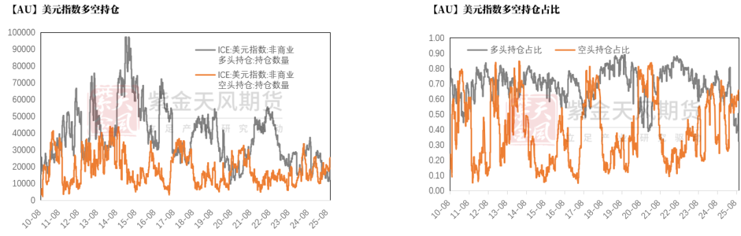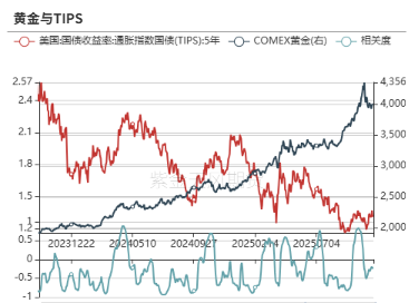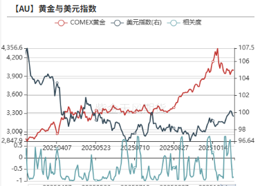上周美元指数与黄金价格同向变动,黄金上周下跌0.06%,美元指数下跌0.18%至99.55,两者滚动相关性增强。