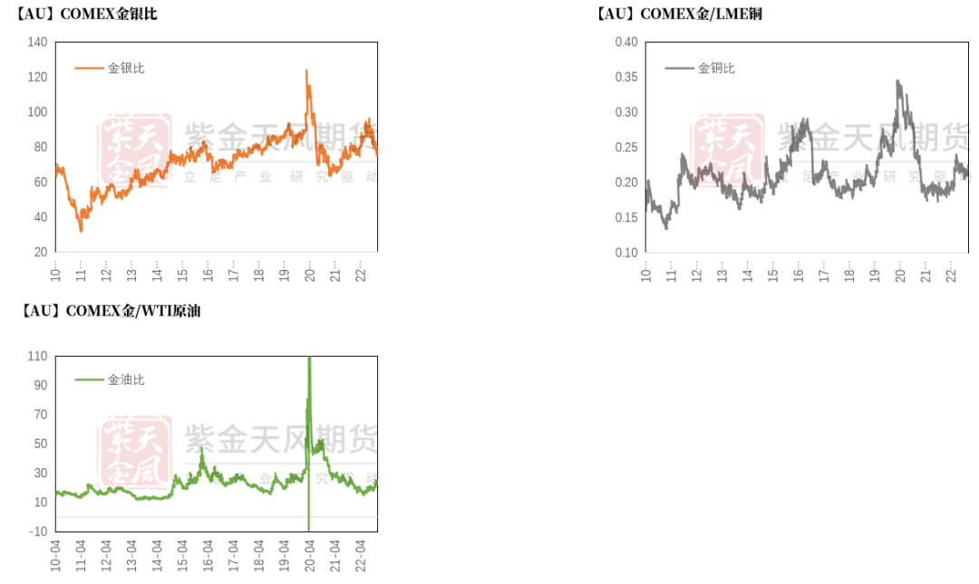 金银比震荡走高,主要因为上周黄金下跌幅度小于白银;金铜比走高,主要因为上周黄金下跌幅度小于铜;金油比环比走高,主要因为上周原油下跌幅度大于黄金。
