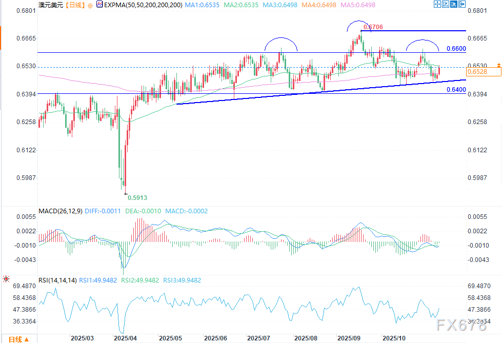 汇通财经APP讯——周一(11月10日)欧盘时段,澳元/美元盘中报0.6528,涨幅0.52%。澳洲联储(RBA)维持利率不变后,澳元/美元汇率在关键支撑位附近维持窄幅波动。该货币对当前较今年迄今高点0.6700有所回落。