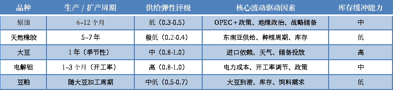 资源集中或政策约束强的商品,如原油依赖中东进口,供给弹性较低(0.3-0.5),地缘事件易放大波动;