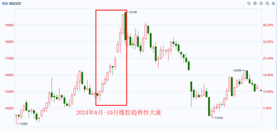 2024年8月至10月,上海期货交易所天然橡胶主力合约价格从1.43万元/吨上涨至1.96万元/吨,累计涨幅达37%,核心驱动因素包括东南亚主产区天气扰动导致供应收缩、国内库存持续去化,且上涨趋势持续 3 个半月 —— 因产能无法短期补充,供给缺口持续放大,波动率维持高位。