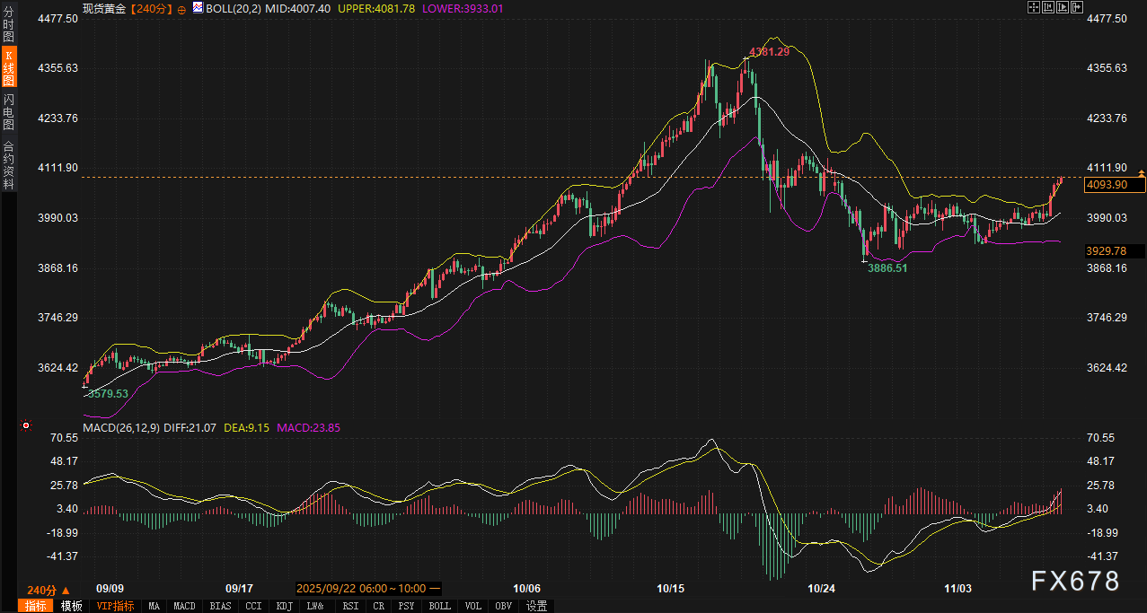 汇通财经APP讯——周一(11月10日)晚间,全球金融市场出现结构性分化。随着美国国会参议院推进政府关门危机的解决方案,市场风险情绪改善,固定收益市场则面临压力。现货黄金作为避险资产,在债市波动中表现出韧性。美元指数微跌0.02%至99.5283,10年期美债收益率上升0.85%至4.132,现货黄金上涨2.31%至4093.84美元/盎司。这一格局反映了美国政治不确定性的初步缓解,以及中东地缘风险(如加沙人质交换提议)带来的微妙影响。整体市场情绪从谨慎转向温和乐观,但债市变化已开始影响汇率和贵金属的短期走势。