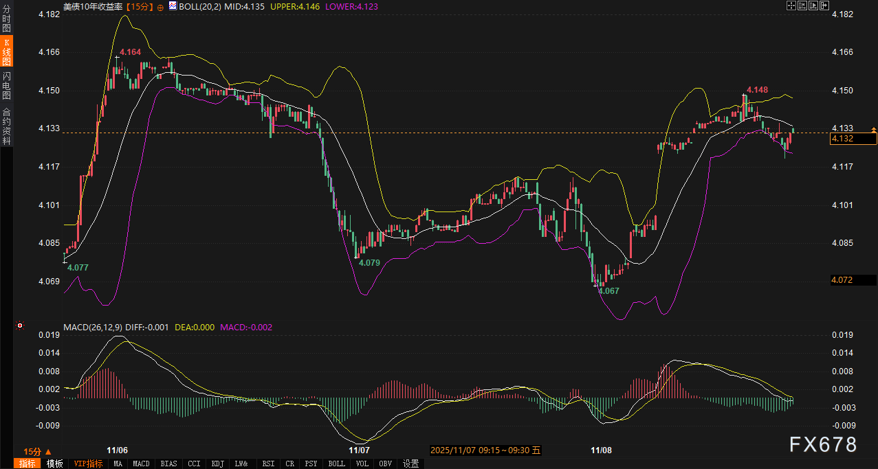 10年期美债收益率的反弹是政治进展与市场流动性共同作用的结果。周一早间,参议院就临时支出法案取得进展的消息传出后,美债期货承压,收益率从低点上升超过8个基点至4.132%。布林带指标(周期20,标准差2)显示,中轨位于4.139%,上轨4.146%,下轨4.132%,当前收益率接近下轨,显示短期下行空间有限,但上轨附近的多头动能有所显现。MACD指标(快线26,慢线12,信号线9)中,快线DIFF为0.002,信号线DEA为0.004,均位于零轴上方,柱状图未明显扩张,但表明多头力量正在积累。
