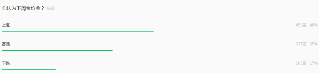 11月3日当周,伦敦金价格开盘3990.72美元/盎司,最高4030.67美元/盎司,最低3928.81美元/盎司,收盘4001.42美元/盎司。市场人士认为本周国际金价震荡偏多可能性较大。投票显示,有48%的读者看涨本周金价、35%看震荡、17%看空。