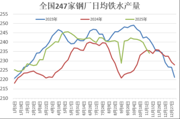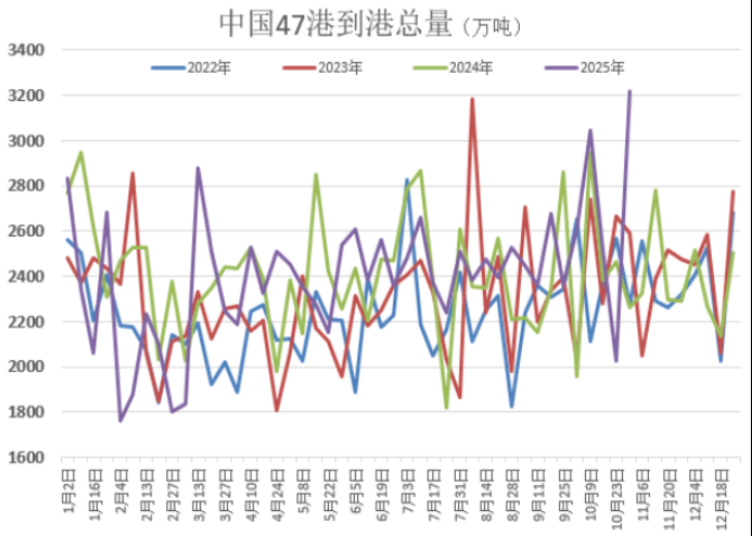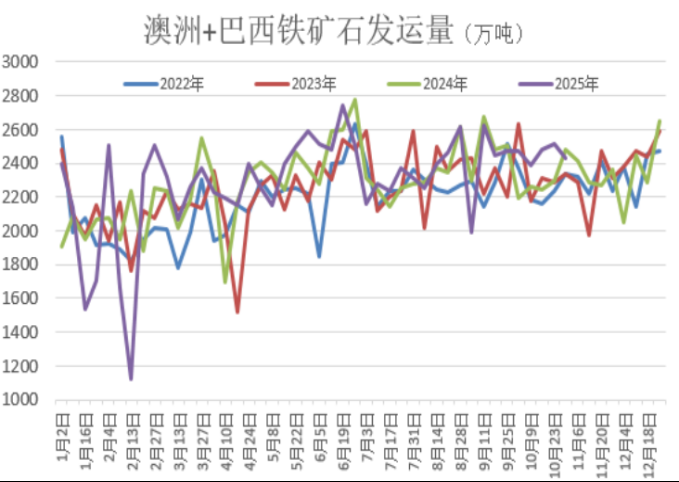 铁矿石作为炼钢主要原料,其行情波动受铁水产量高低影响较大。数据显示,2025年钢厂高炉产能利用率和铁水产量在4月下旬至10月中旬,这两个数值均处在相对高位运行,直接对铁矿石现货需求构成支撑。但随着“金九银十”落空,同时北方天气转冷,下游需求减少预期,使得钢厂高炉检修增多。我们发现铁水产量已连续六周下滑,产量也从日均242万吨降至234万吨。从过往历史数据分析,四季度钢厂高炉产能利用率和铁水产量会处在年内相对低位对铁矿石现货需求支撑减弱。