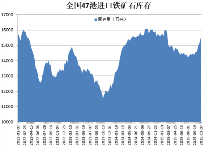 11月7日Mysteel统计全国47个港口进口铁矿库存总量15624.13万吨,环比增加351.20万吨;日均疏港量335.55万吨,增4.33万吨。分量方面,澳矿库存6388.19万吨,增152.79万吨;巴西矿库存6304.81万吨,增126.94万吨;贸易矿库存9977.79万吨,增324.58万吨;粗粉库存12138.39万吨,增217.51万吨;块矿库存1957.61万吨,增74.31万吨;精粉库存1204.34万吨,增30.51万吨;球团库存323.79万吨,增28.87万吨。在港船舶数量111条,降8条。