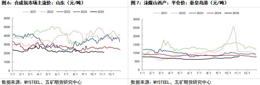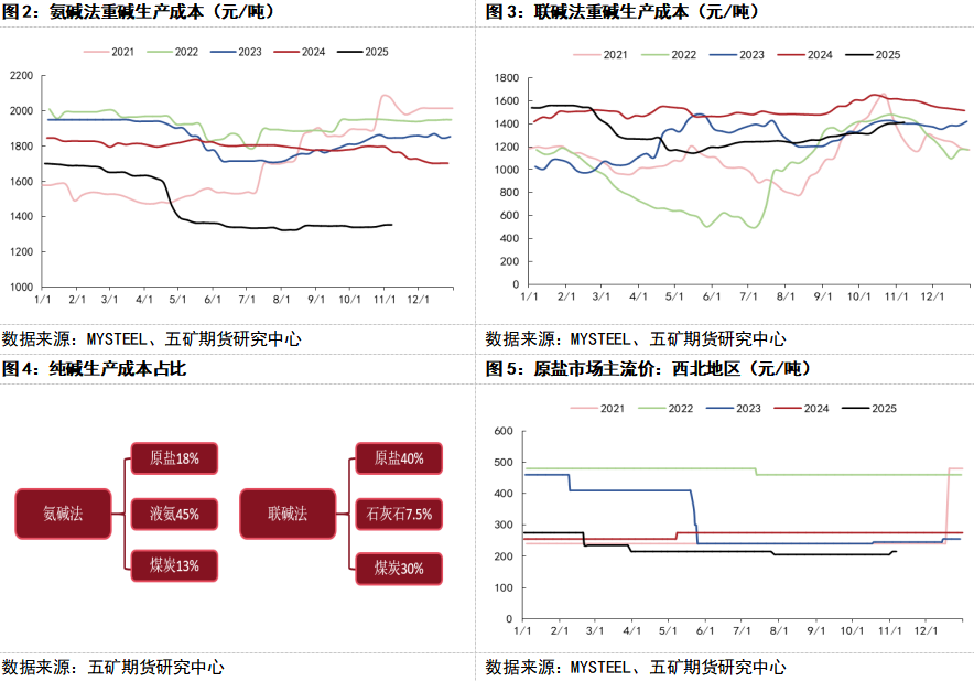 另一方面,生产成本的系统性下移,为纯碱价格的下跌打开了额外的空间,并构成了本轮跌势的另一个核心驱动因素。从原料端看,作为纯碱生产主要原料的原盐,其市场价格今年以来持续走低,不断刷新近五年来的历史低位记录。同时,作为氨碱法生产工艺关键原料之一的液氨,其价格也同样长期徘徊于历史低位区间。根据MYSTEEL数据显示,氨碱法成本较去年同期减少了近23.39%。燃料方面,煤炭价格也经历了长时间的下跌过程。正是供需基本面的持续失衡与成本支撑平台的显著坍塌两者同时发生,共同导演了本轮跌势。