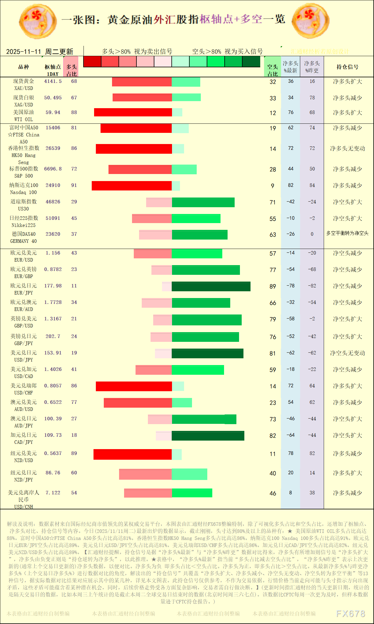 一张图:2025/11/11黄金原油外汇股指“枢纽点+多空持仓信号”一览