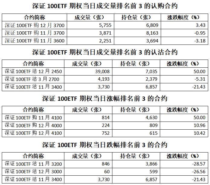 深证100ETF期权总成交面额23.61亿元,增加25.30%,期现成交比为0.01,权利金成交额0.18亿元;期权总成交量79,853张,增加26.11%,其中认购期权成交量21,000张,认沽期权成交量58,853张,认沽认购成交比率为2.80(上一交易日认沽认购成交比率为3.55)。