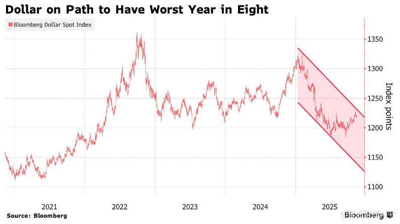 Jen以其提出的“美元微笑理论”(Dollar Smile Theory)而闻名,他预测,在特朗普总统任期的剩余时间里,美元指数还将下跌约13.5%。这意味着在2025年已累计下跌约7%的基础上,美元或将迎来八年来最糟糕的一年。