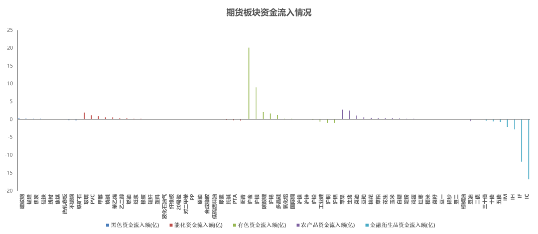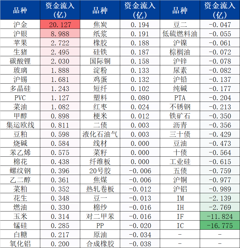 资金流入前三名为沪金、沪银和苹果;流出前三名分别为IC、IF和IH。