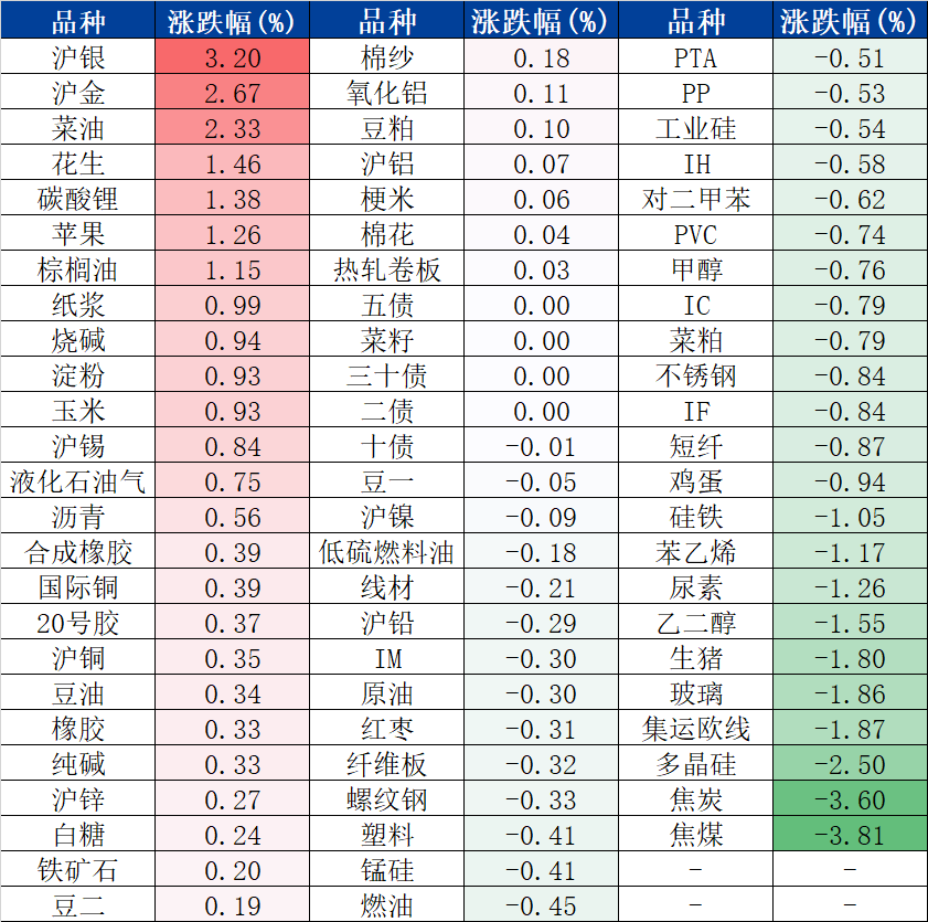 涨幅居前的三个品种分别是菜沪银、沪金和菜油;跌幅居前的是焦煤、焦炭和多晶硅。