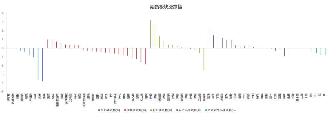 从板块整体表现看,贵金属上涨,黑色多数下跌。