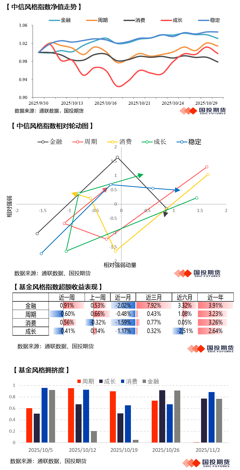 中信五风格方面,上周五风格收益分化,周期风格收益表现偏强;风格轮动图显示相对强弱层面成长风格边际回升,指标动量层面这个金融风格小幅回落,周期风格环比提高。公募基金池方面,近一周金融与消费风格基金超额表现较优,从基金风格系数走势来看产品对成长风格偏移度小幅提升,拥挤度方面本周市场整体指标变动不大,当前消费风格位于近一年偏高拥挤区间。