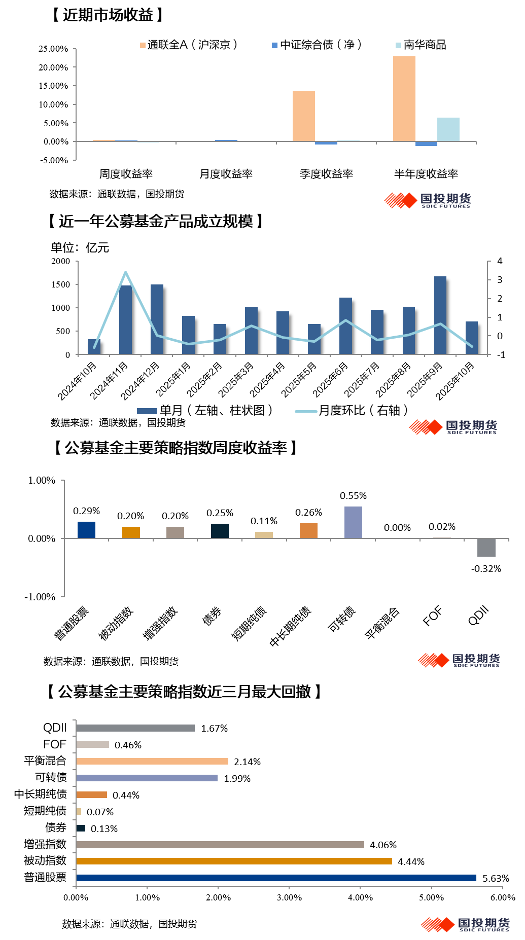 截至2025/10/31当周,通联全A(沪深京)、中证综合债与南华商品指数周度涨跌幅分别为0.36%、0.25%、-0.27%。