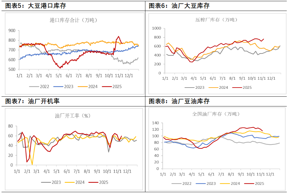 与中加僵持的情况不同,中美贸易关系出现缓和,中方重启采购美豆,达成1200万吨大豆的采购协议。目前已购买部分船期,2025 年12月采购26.4万吨(预计2月到港),2026年1月采购19.8万吨(预计3月到港),2-3月国内大豆供应短缺预期将明显缓解。同时,由于今年巴西丰产,中国较提前装运了部分大豆,11 月的大豆到港量比往年同期将有所增加。根据钢联估计,2025年11月总供应1561万吨、12月总供应1400万吨,分别较去年同期增加17.10%、2.00%;11月压榨量900万吨,较去年同期增加10.02%;11月期末库存650万吨,较去年同期增加30.78%。预计11月大豆供应仍旧较为充足,国内大豆库存及油厂开机率维持高位。