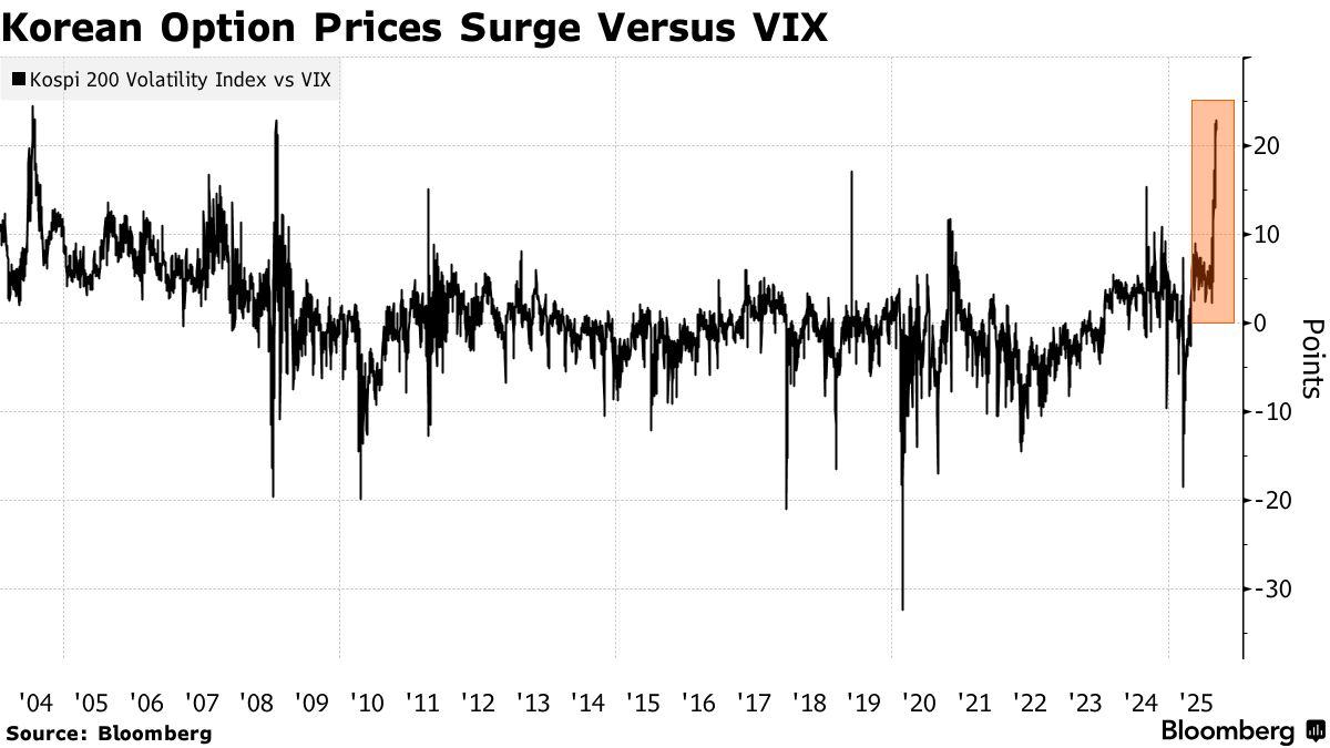 交易员对韩国股市波动的押注大幅增加,这引发了人们对今年表现最佳的市场持续上涨态势的担忧。韩国综合股价指数(KOSPI)波动率指标已飙升至4月因特朗普加征关税而导致股市暴跌时的水平。这一飙升标志着韩国股市与其他市场相对平静状态的罕见背离,目前韩国综合股价指数波动率与芝加哥期权交易所波动率指数的差距已接近2004年以来的最大值。