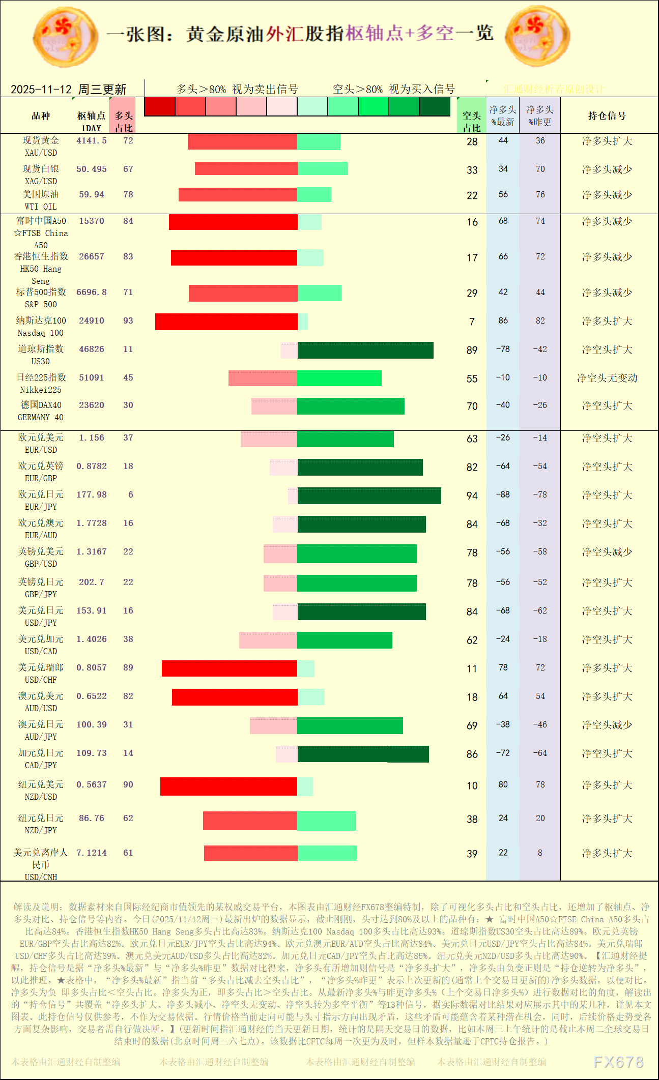一张图:2025/11/12黄金原油外汇股指“枢纽点+多空持仓信号”一览