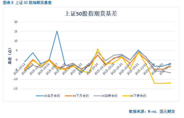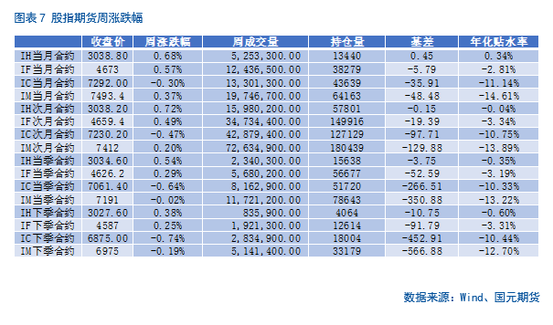 上周股指期货合约多数上涨,IH以及IF表现相对较好。近期股指期货升贴水较为稳定,市场预期平稳。