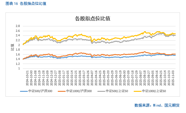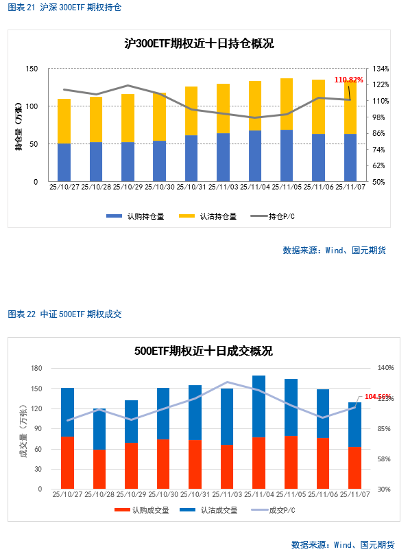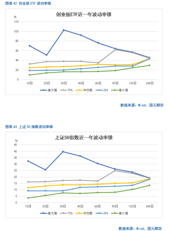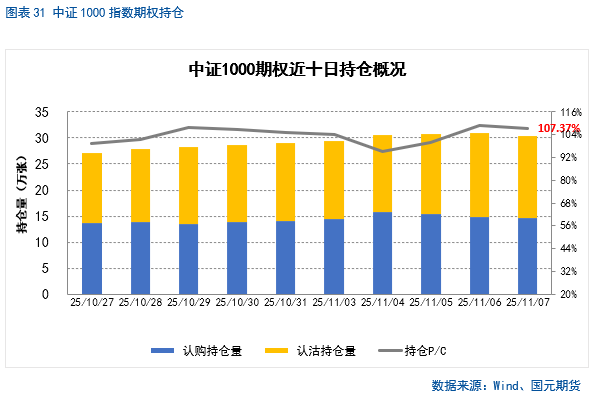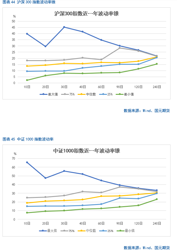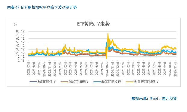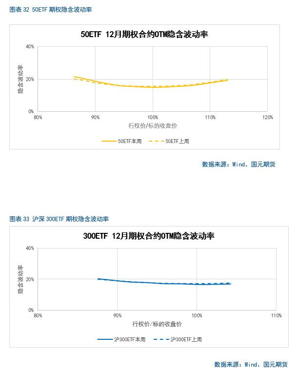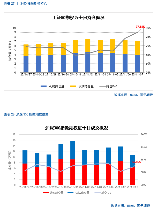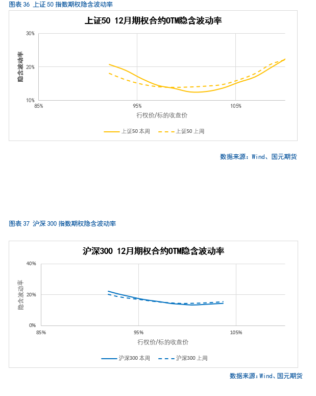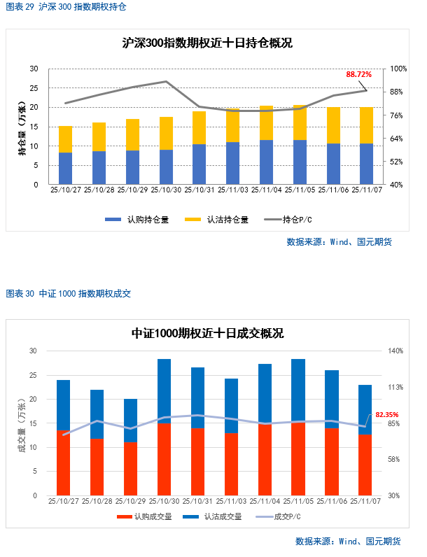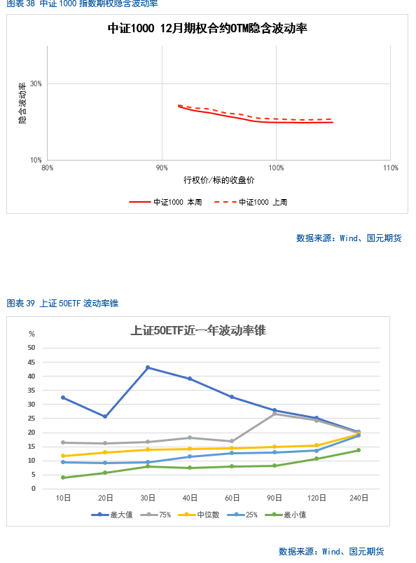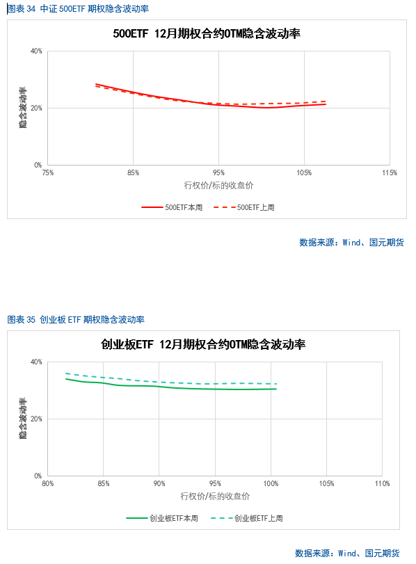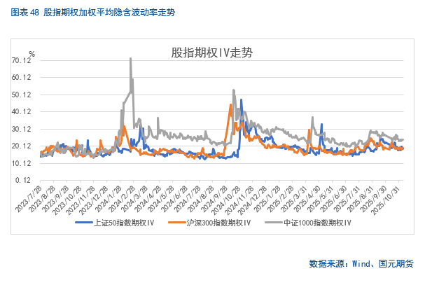 股指震荡上涨,期权加权平均隐含波动率略有下降,仍保持中等偏高水平。当前各标的期权加权平均隐含波动率在17%-34%附近,整体处在近年较高水平。现货指数近两个月波动较大,市场对于股指大幅波动预期较高。