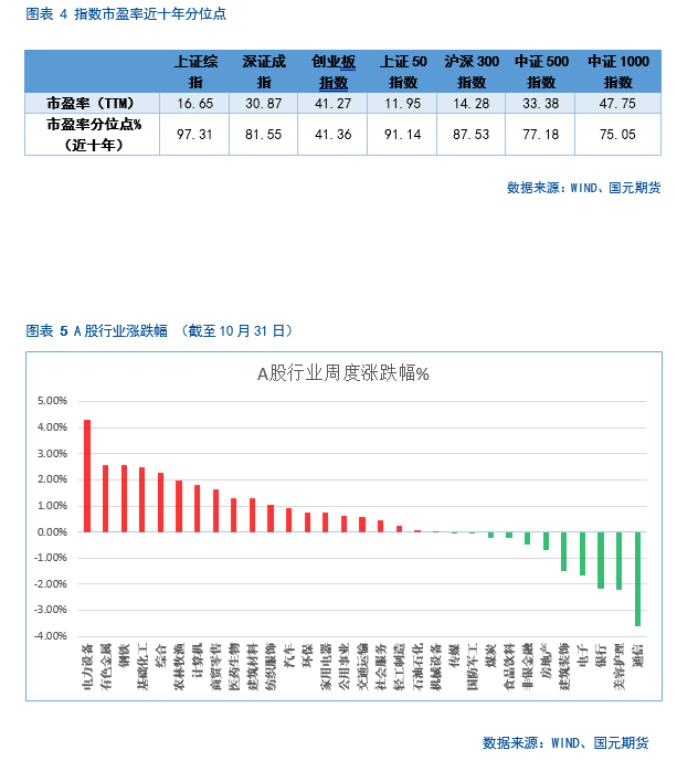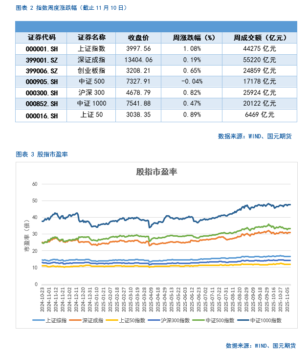 上周美国政府停摆刷新纪录、海外波动放大背景下,A股展现韧性:主要股指震荡上行,上证指数约涨1.1%,上证50小幅跑赢,权重蓝筹托底明显。期指升贴水平稳、期权PCR维持中高水平,未见恐慌情绪。10月CPI同比+0.2%、核心CPI+1.2%,PPI降幅收窄,均好于预期,“反内卷”、“稳价”政策效果开始体现。