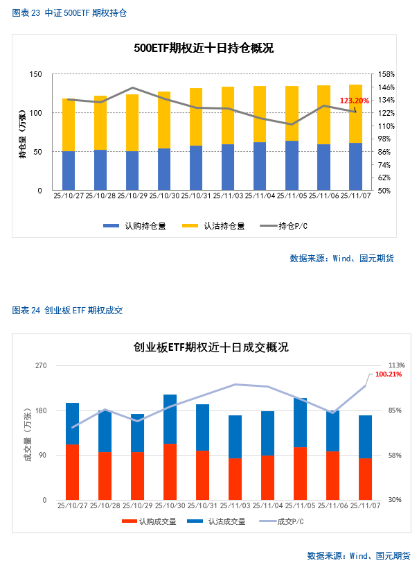 期权方面,上周期权成交量保持稳定。期权持仓PCR整体处在高位,期权卖方当前对于500ET、中证1000指数等标的强烈不看跌。同时,期权成交PCR有所回落,市场裸多投资者比例有所减少。