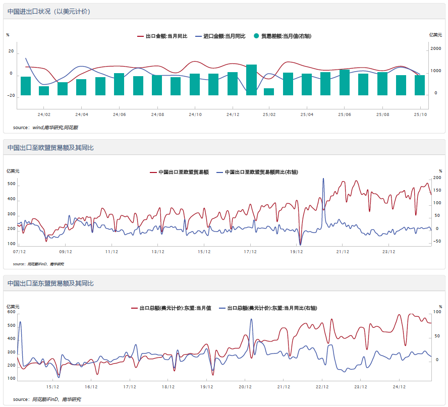 1)总体来说三季度货币政策执行报告中海外局势总结相较于二季度有所弱化。有别于二季度报告中的“全球经济缓慢复苏”,报告指出三季度“全球经济增长动能不足”,主要在于三季度欧元区、英国GDO增速均有所回落,而亚太地区方面尽管日本GDP环比改善,但出口也出现下滑趋势。在主要关注点中,强劲股市背后的市场风险和公共部门债务问题依旧存在潜在风险,而除此之外本次专门强调了地缘政治冲突对政治金融体系稳定性的冲击——尽管中美已经就芬太尼关税、稀土等问题达成阶段性一致,但当下依然存在许多地缘不确定性,例如10月下旬美俄元首布达佩斯会见推迟后谈判似乎再度陷入停滞,欧洲也有加大制裁力度的倾向。另外近期美国最高法院针对特朗普加征关税的合法性进行辩论,后续也存在较大不确定性。