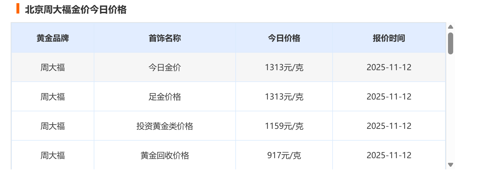 本报记者实时查询数据显示,11月12日主流黄金品牌报价集体走高:周大福金饰价格定格在1313元/克,较前一日上调5元/克;六福珠宝同步跟进,金饰价格涨至1311元/克,较前一日上涨1元/克;周生生报价1309元/克,较前一日微涨1元/克;老庙黄金则以1310元/克持平前一日价格,同样站在1300元/克以上区间。
