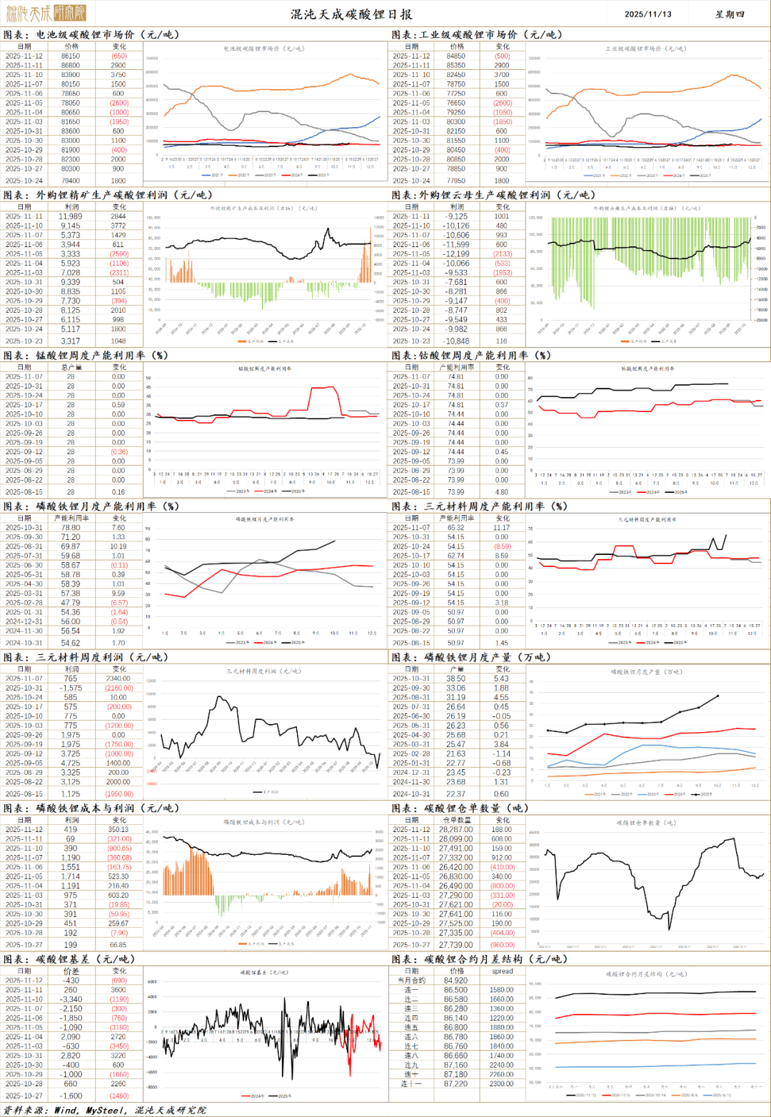 昨日碳酸锂主力合约收盘价86580元/吨,涨跌幅-0.21%。主力合约持仓+2473至528966手,仓单+188至28287吨。现货方面,电池级碳酸锂报价-650至86150元/吨,工业级碳酸锂报价-500至84850元/吨。锂精矿均价+7.5至1020美元/吨。
