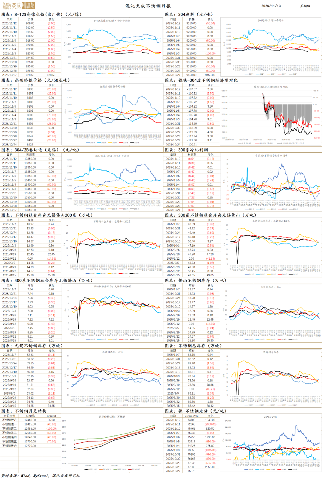 综合来看,在进口资源充足的环境下,原料端镍铁价格维持回落,印尼暂停镍冶炼产能审批,短期并不直接影响镍铁供应。供冶炼的端近期不锈钢厂开始陆续有减产动作,但整体而言对供需改善有限。需求端不锈钢需求进入淡季。当前阶段不锈钢供需过剩格局清晰,价格维持底部震荡。后续观察不锈钢减产力度与持续性,工业品实际需求走向、供需两端政策力度与落地情况以及原料端价格走向。