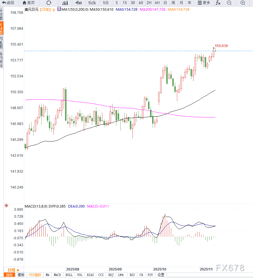 从技术面看,美元兑日元(USD/JPY)在周三突破154.50阻力位,形成新的上行动能。若价格稳定在155.00心理关口之上,将确认多头趋势延续,目标区间位于155.60至156.00。
