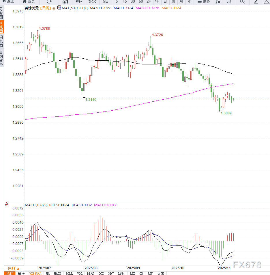 从技术面来看,英镑兑美元近期连续三日承压,价格在1.3100至1.3140区间震荡整理。短期支撑位位于1.3080附近,若跌破该位,或进一步下探至1.3030。上方阻力位则集中在1.3180和1.3220,一旦突破,可能触发短线反弹行情。