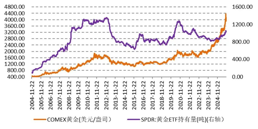 图1:全球最大的黄金ETF——SPDR持仓和黄金价格走势对比