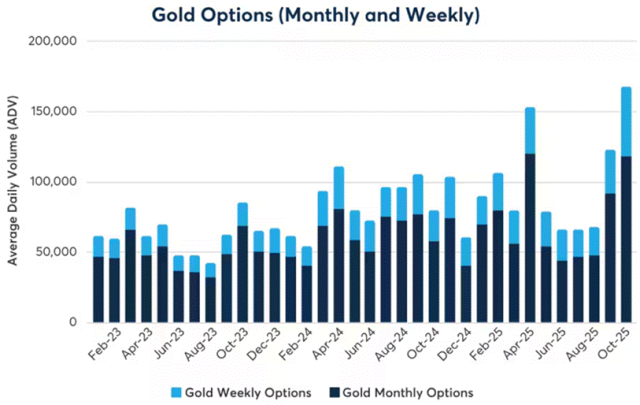 综上所述,随着美国政府有望结束“停摆”和美联储12月结束缩表,美元流动性危机的担忧缓和,宏观叙述转向乐观,引发黄金抛售的利空逐步消散。再加上央行购金长期利好,以及投资需求止跌回升,黄金由此止跌反弹,但未来波动率还将处于高位。投资者可以关注芝商所旗下的COMEX黄金每月期权(OG)来对冲波动率放大带来的投资风险。在对冲需求驱动下,黄金(OG)期权交易量近期飙升,月度和周度合约的日均交易量(ADV)总和创下了 17.5 万份合约的历史新高(看下图)。