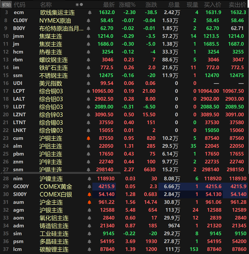 此外,碳酸锂主连涨1.39%,多晶硅主连涨3.69%,工业硅主连跌0.22%。欧线集运主连跌2.3%报1632。