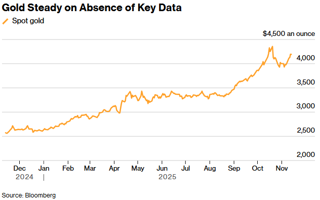 政府停摆期间的数据空白导致投资者在评估全球最大经济体的状况时如同"盲飞",或只能依赖私人统计数据。黄金本周上涨,部分原因是市场预期政府恢复运转后美联储将进一步降息——这对不生息的黄金而言是利好。