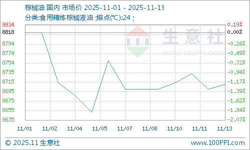 据生意社商品行情分析系统显示:11月1日开始,国内棕榈油行情振荡下行。11月1日,棕榈油市场均价8818元/吨,11月13日,棕榈油市场均价8710元/吨,价格下跌1.22%。
