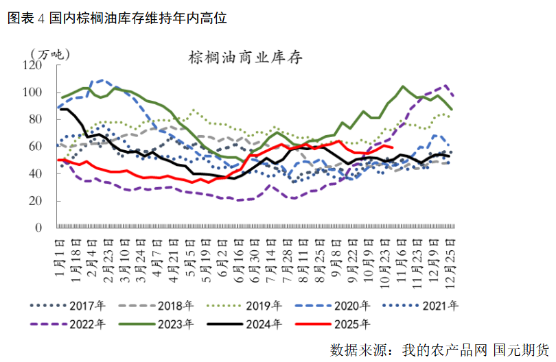 2025年10月,国内棕榈油市场呈现进口阶段性回升、库存压力累积、需求淡季特征显著的格局,供需双弱态势下价格承压运行。高企的进口成本抑制贸易商采购意愿,部分订单被迫推迟或取消。海关数据显示,2025年9月我国棕榈油(不含硬脂,下同)15万吨,同比减少32.2%;1-9月我国累计进口棕榈油174万吨,同比减少15.7%。随着气温下降,棕榈油在食品加工领域的需求(如油炸食品、烘焙用油)减少,沿海地区提货量环比下降。期货价格下跌引发终端企业逢低补库,不过,这种采购属于被动补货,难以持续提振需求。据Mysteel调研显示, 截至2025年10月31日(第44周),全国重点地区棕榈油商业库存59.28万吨,环比上周减少1.43万吨,减幅2.36%;同比去年50.54万吨增加8.74万吨,增幅17.29%。