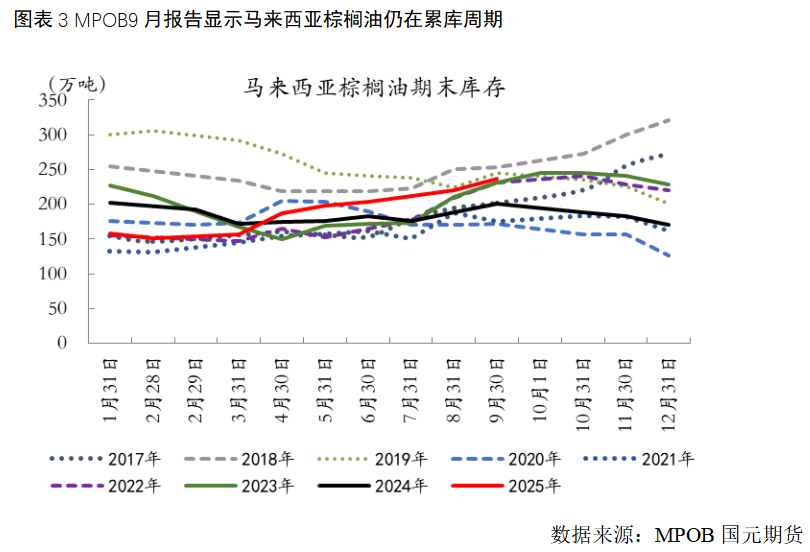 根据高频数据显示,10月马棕呈现供应强劲而需求疲软格局。产量来看,南部半岛棕榈油压榨商协会(SPPOMA)数据显示, 2025 年 10 月 1-31 日马来西亚棕榈油产量环比上月增加 5.55%,较 10 月 1-25 日的 2.78% 进一步扩大。这一增长主要由单产和出油率的双升驱动:单产环比增加 4.50%,出油率提升 0.20%。马来西亚棕榈油局(MPOB)9 月报告显示产量为 184.1 万吨,市场预估 10 月产量将增至 194 万吨,环比增加 5.6%,与 SPPOMA 全月数据趋势一致。反映出马来西亚棕榈油增产周期仍在延续。马来西亚棕榈油月底出口好转,根据船运机构高频数据显示,马来西亚10月棕榈油产品出口量环比增加超4%。整体来看,产量环比增幅超过出口环比增幅,马棕10月库存增加预期仍相对较强,需重点关注MPOB在月中旬发布的供需平衡报告指引,当前市场对该报告预期相对偏空。