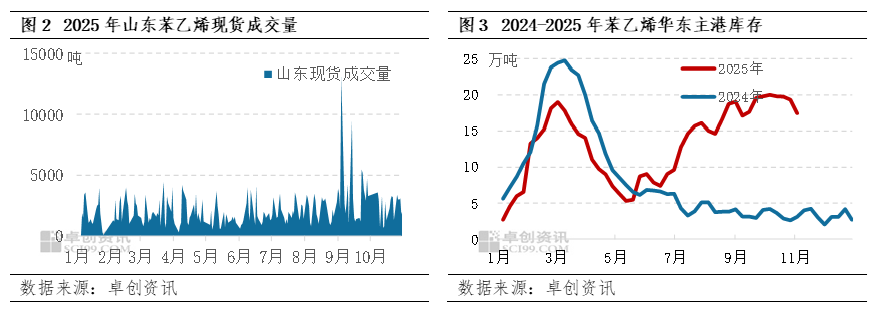 10月9日山东京博思达睿宣布因上游裂解装置技改,苯乙烯装置同步停车,且重启时间待定,山东供应有减少预期,其他主流工厂以及市场持货商挺价意愿增强,20日之前山东苯乙烯价格跌幅小于华东,21-23日价格修复时,山东涨幅也大于华东,虽然山东价格仍贴水华东,但两地套利窗口处关闭状态,鲜有山东货源流向江苏。24日之后,两地套利窗口逐步开启,一方面因前期山东与江苏套利窗口关闭,山东现货成交转弱,工厂库存开始承压;另一方面京博装置虽停车,但其未取消10月份合约量,仍有存量现货流向市场,山东供应减量不及预期。主流工厂开始让利清库,使得山东市场价格跌幅放大。又恰逢月下旬华东纸货交割期,主港库存开始去库,山东货源流向华东及周边市场。