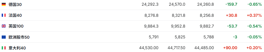 2.截至发稿,德国DAX指数跌0.65%,英国富时100指数跌0.54%,法国CAC40指数涨0.37%,欧洲斯托克50指数跌0.05%。