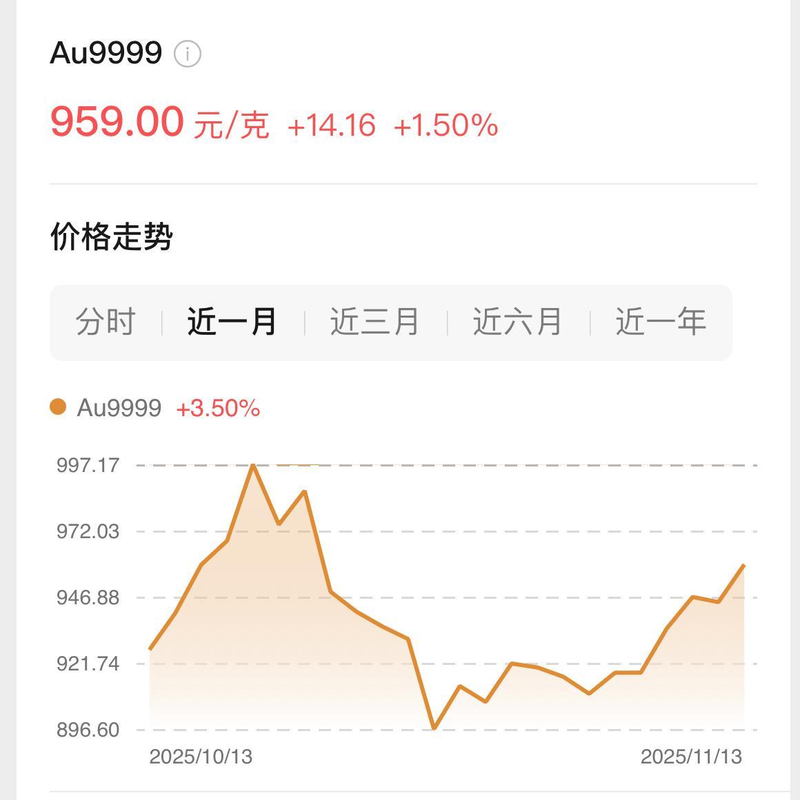 截至11月13日下午4点半,国内现货黄金报959元/克