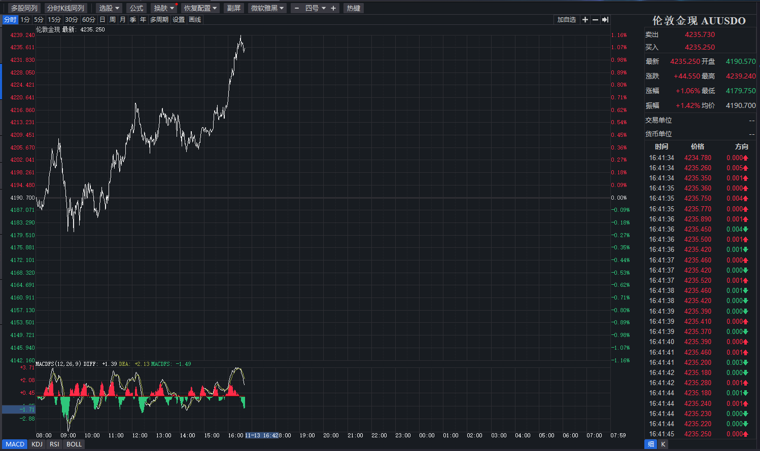 截至11月13日下午4点半,国际现货黄金报4235.25美元/盎司